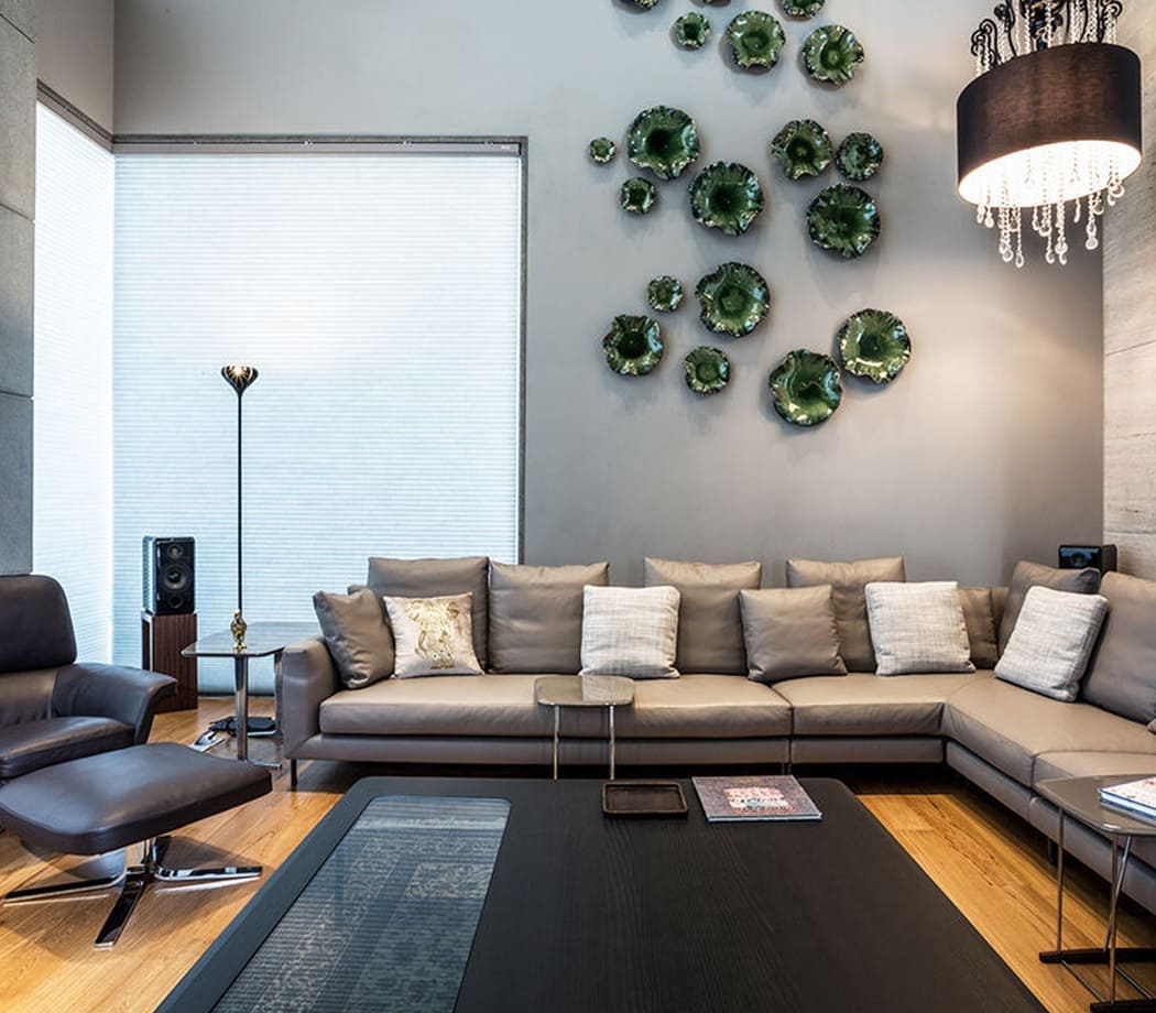 The materials employed tend toward the organic choices, like marble, along with stone, glass combined with teak, and a color palette of natural shades, for a ‘natural chic’ effect that is also echoed in the choice of seating upholstery, for the most part a sophisticated beige leather. The spacious, light-filled living room is furnished with a corner composition of the Allen seating system, paired with Blake-Soft armchairs and Perry and Brice coffee tables. A second lounge area features Sherman sofas flanked by Jensen armchairs, Sullivan coffee tables and a Wilson console. In the master bedroom, the Bedford Bed holds pride of place, with Morrison nightstands, Kirk Bench and a Jensen armchair and matching footstool.