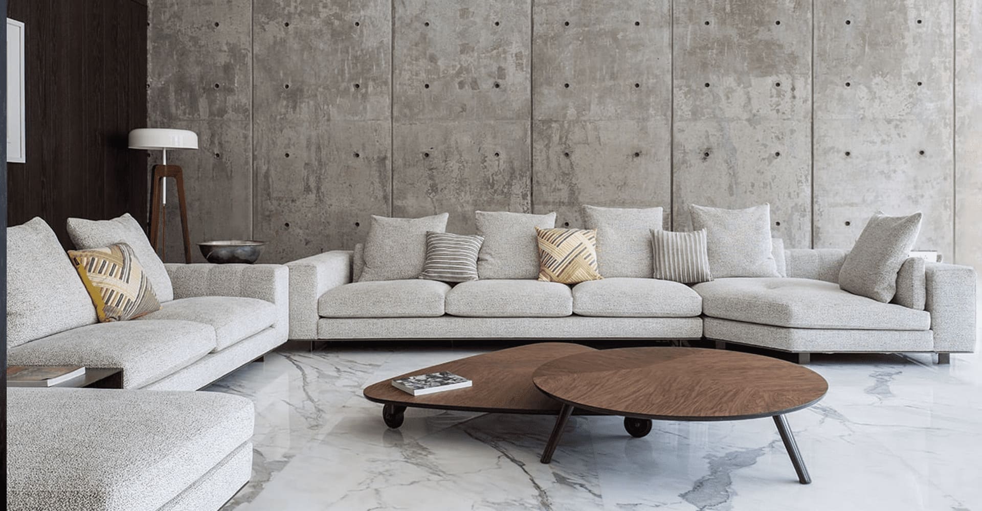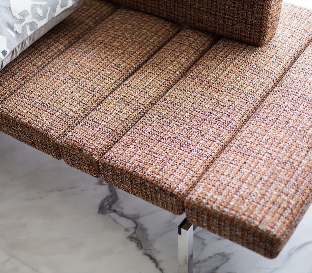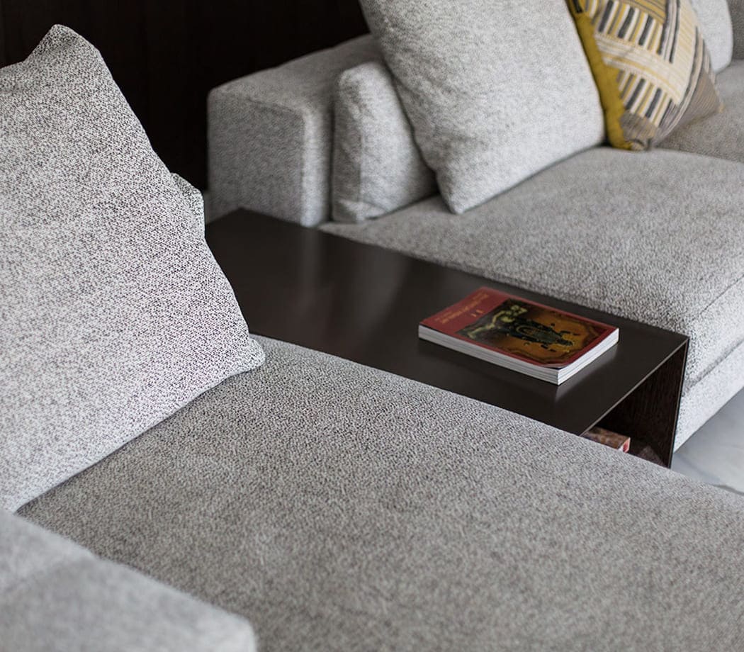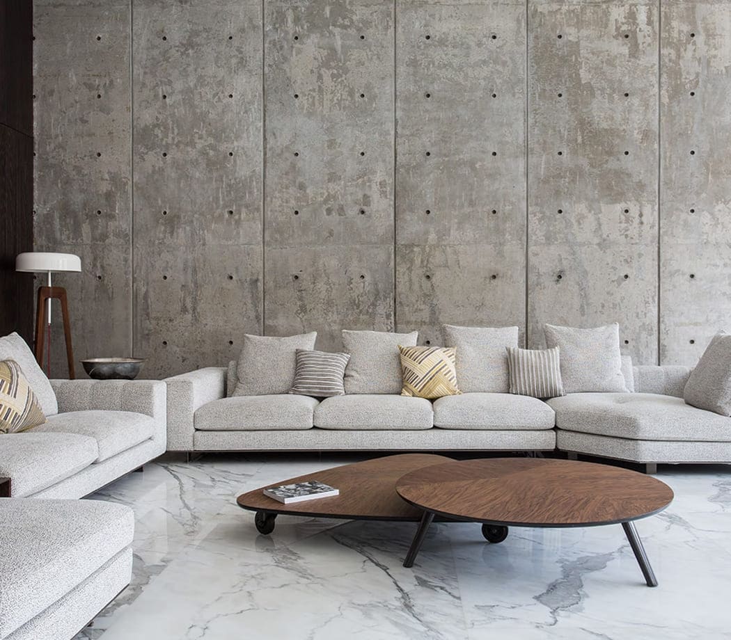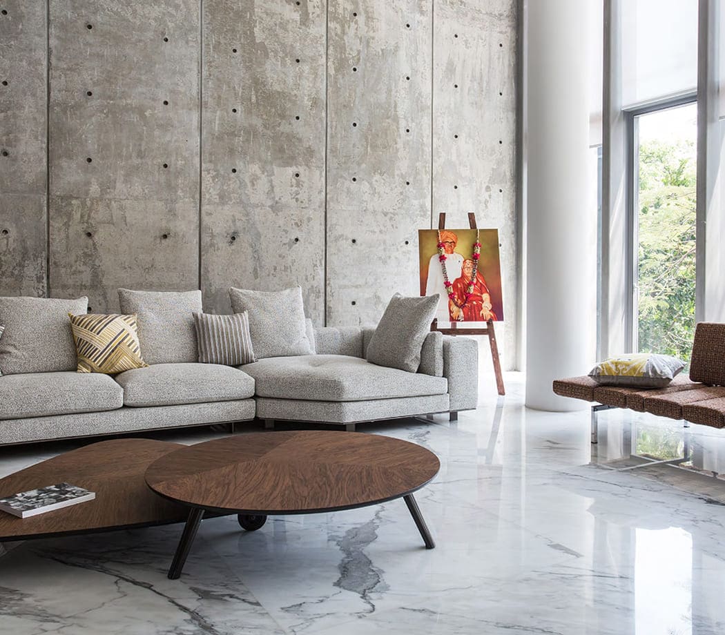 Concrete walls, vast windows and marble floors are the common denominator in many of the rooms. Expansive windows that give onto the garden fill the living room with light, illuminating the compositions of the Freeman seating system, combined with Sullivan coffee tables in walnut and a Smith bench upholstered in a sophisticated tweed fabric in shades of orange, that were chosen to furnish the room.